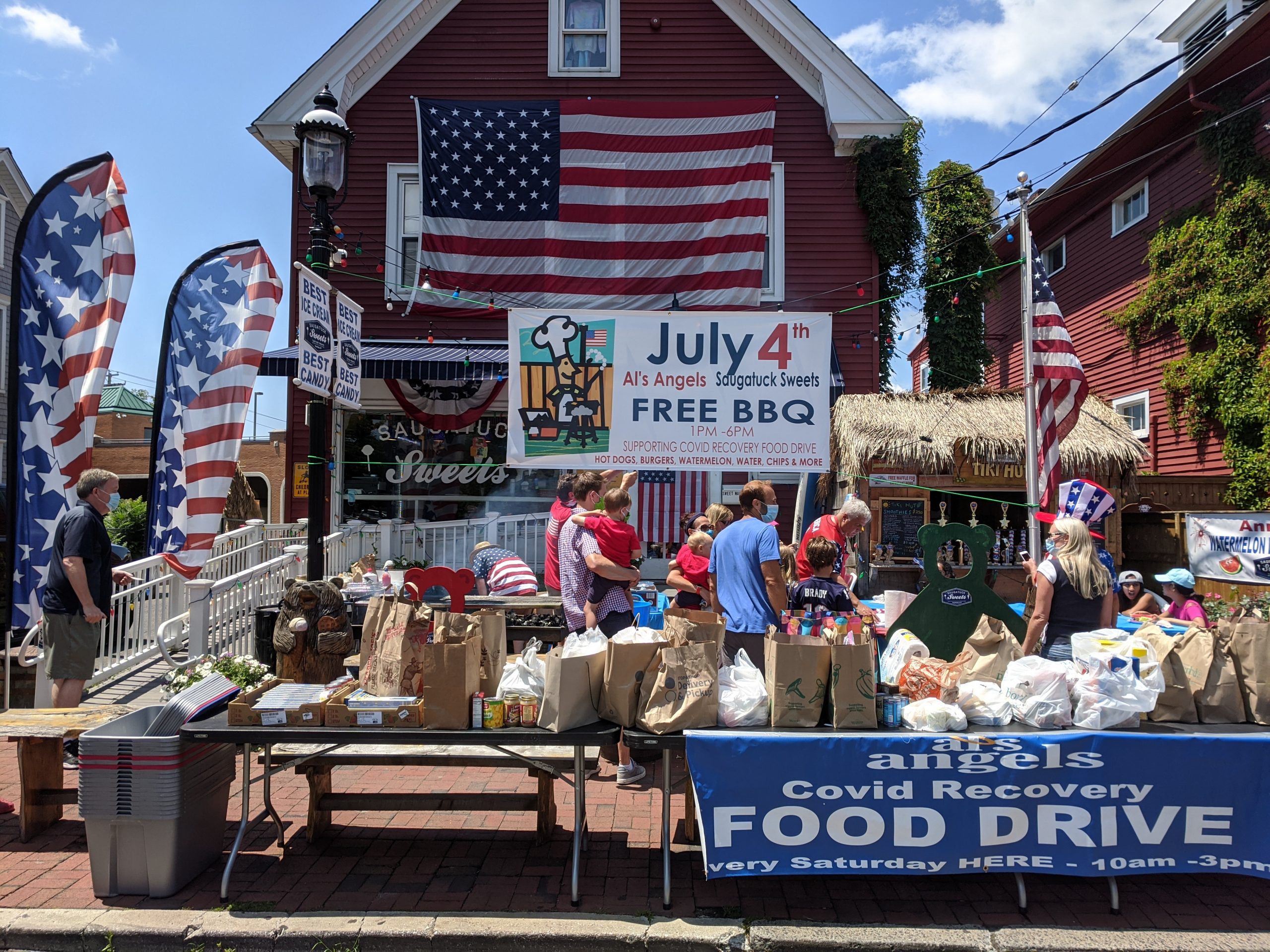 #Fairfield CT– Al’s Angels collect food for the Covid Recovery Food Drive to help those impacted by the Covid health and economic crisis at Saugatuck Sweets at 28 Reef Road today, July 4th. They have held its third annual watermelon eating contest. Those donating food were treated to free barbeque.