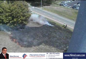 2020-08-10@1:49pm–#Milford CT– #cttraffic– Firefighters extinguish a brush fire on I-95 near exit 35 and 36. This is the third time in a month this has happened in the same locations at the same time.
