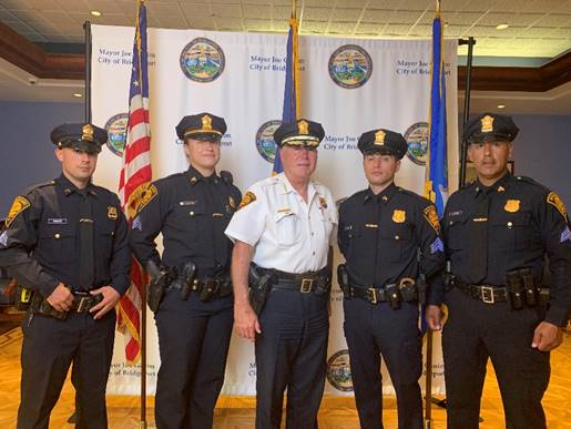 Bridgeport, CT –The promotional oath of office was administered for four Bridgeport Police officers on August 10th, 2020 at Margaret Morton Government Center which elevated Police Officer Jarrett, Martinez, Paoletti, and Caiazzo to their new position as Sergeants in the City of Bridgeport.