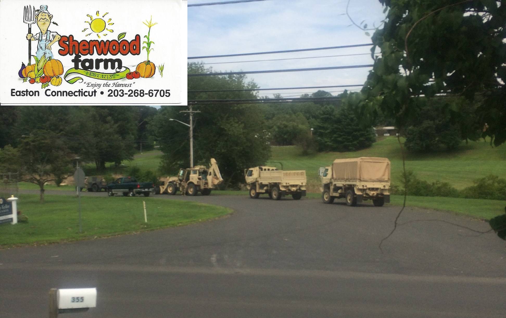 Tom Sherwood of Sherwood Farms at 355 Sport Hill Road in Easton shared this photo the National Guard parked across the street from his farm. Tom says the farm has power but no phone or cable so he is currently unable to take credit cards at this time.