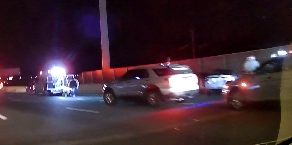2020-11-22@2:02pm–#Bridgeport CT– #cttraffic– Three people were injured, two seriously on a one-car crash on I-95 southbound near exit 26. You can see the car facing into the jersey barrier in the photo.