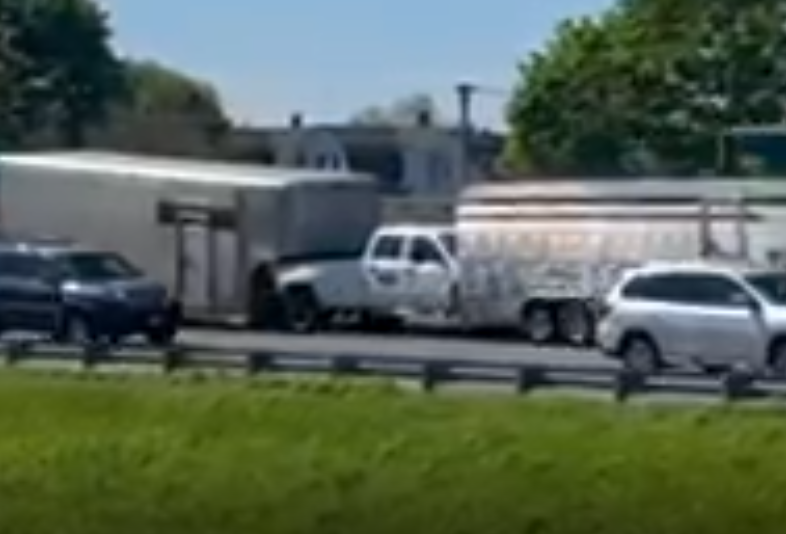 2021-05-12@9:23am–#Stratford CT– #cttraffic- A viewer sent in this photo of a crash on I-95 northbound near exit 31. It appears a pickup towing a livestock trailer hit the back of another livestock vehicle. It is not known if there are any livestock in the trailers.