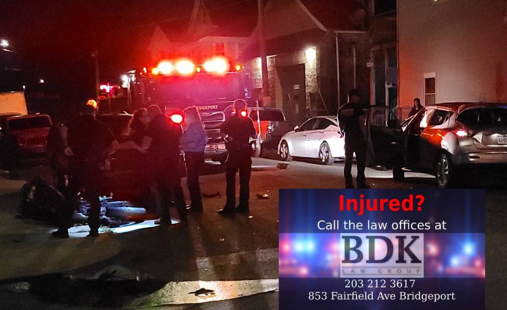 2021-06-13@12:49am–#Bridgeport CT– Another crash at Olive and Norman Street, this time between a car and motorcycle. The motorcyclist was standing and talking with first responders with possible injury to his left side. The car also hit a parked car.