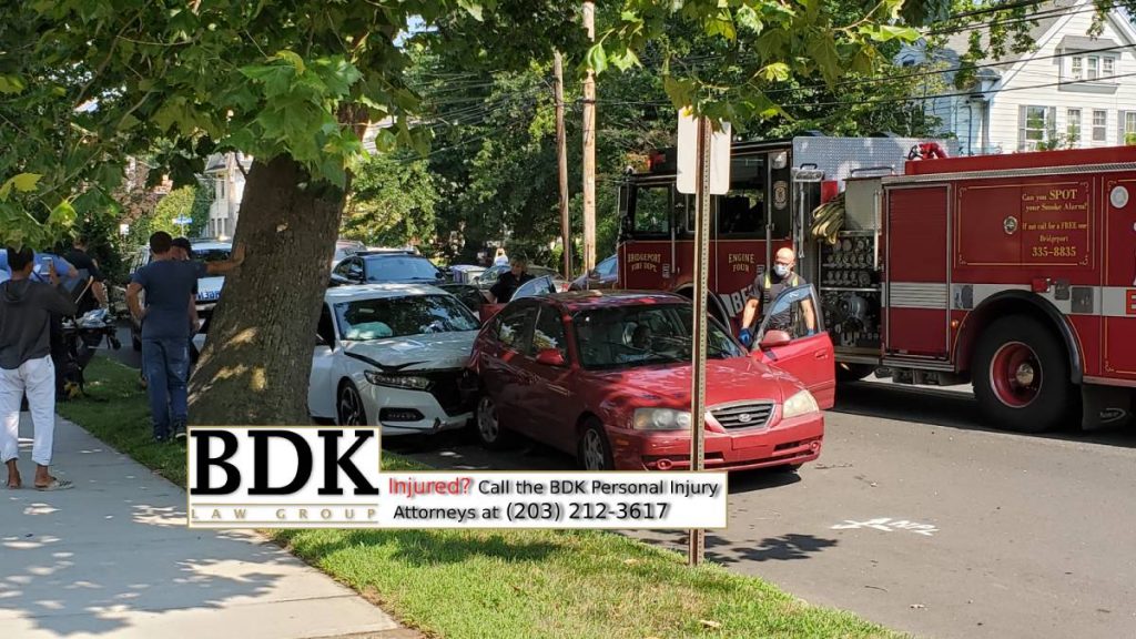 2021-08-27@10:38am–#Bridgeport CT– First responders on scene of a two car crash at Clinton near Elmwood assessing how many were injured. There was one person in the red car and someone in the back seat of the white car.