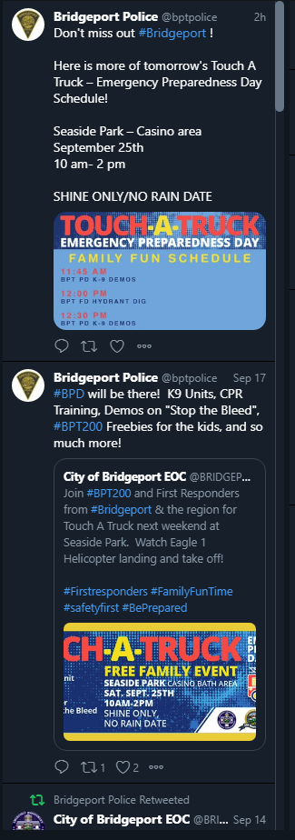 2021-09-25@10:14pm–#Bridgeport CT– First responders dispatched to a person shot in the chest at Pembroke and Shelton Street. EMS reported the victim may have walked to the hospital and left without a patient. Media alert at 10:20 says there was an assault with a dangerous weapon at Grant Street which usually means a walk-in to Bridgeport Hospital. Scott Appleby of Bridgeport Director Office of Emergency Management &Homeland Security/Emergency Communications said “Incidents of significance are reported to the public via social media and through media.” All that’s posted on their Twitter account something about their touch-a-truck this weekend. I’m doing the best to report despite the city’s efforts to hide the news from you. According to their Twitter account there has been no crimes in months! Nothing more to see, move along…..