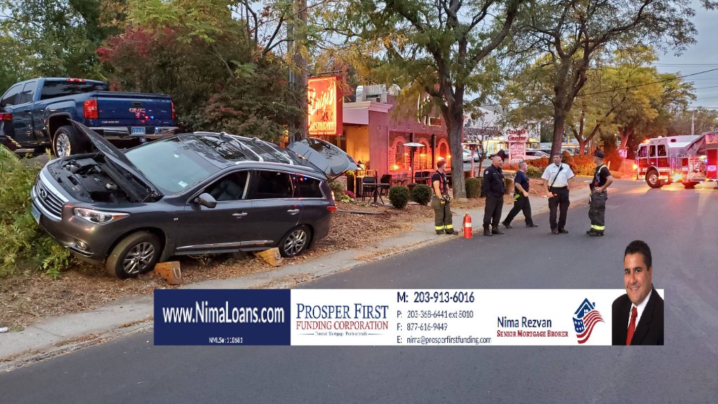 2021-10-24@5:55pm–#Fairfield CT– Firefighters were called to extricate the driver that was injured with they lost control of their car and went up the embankment in front of Luigi’s on the Post Road. The blue truck in the background was not part of the incident and was legally parked in the strip mall above.