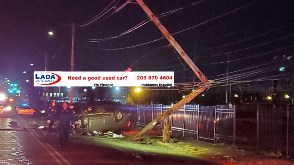 2021-12-16@11:07pm–#Bridgeport CT– First responders on scene of a car that snapped a utility pole and rolled over. on Barnum Avenue between Seaview and Helen Street. Firefighters had to free the driver that was entrapped in the car. The driver was transported with unknown injuries.