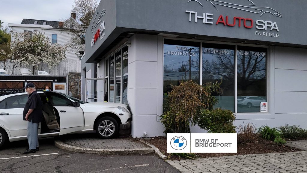 2022-05-04@5:11pm–#Fairfield CT– #Southport CT– An elderly couple smashed their Mercedes into Auto Spa located at 3266 Post Rd, Southport. There were no injuries. The building inspector was called to inspected the integrity of the building.