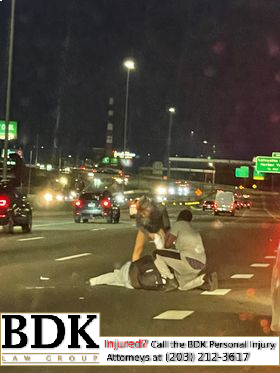 2022-06-29@9:22am--#Bridgeport CT-- cttraffic-- A viewer, Dominick Spadaro sent in this photo of motorists on I-95 northbound near exit 27A tend to motorcyclist who was seriously injured in a crash. The motorcyclist was stabilized in Bridgeport Hospital and then transported to Yale New Haven Hospital.