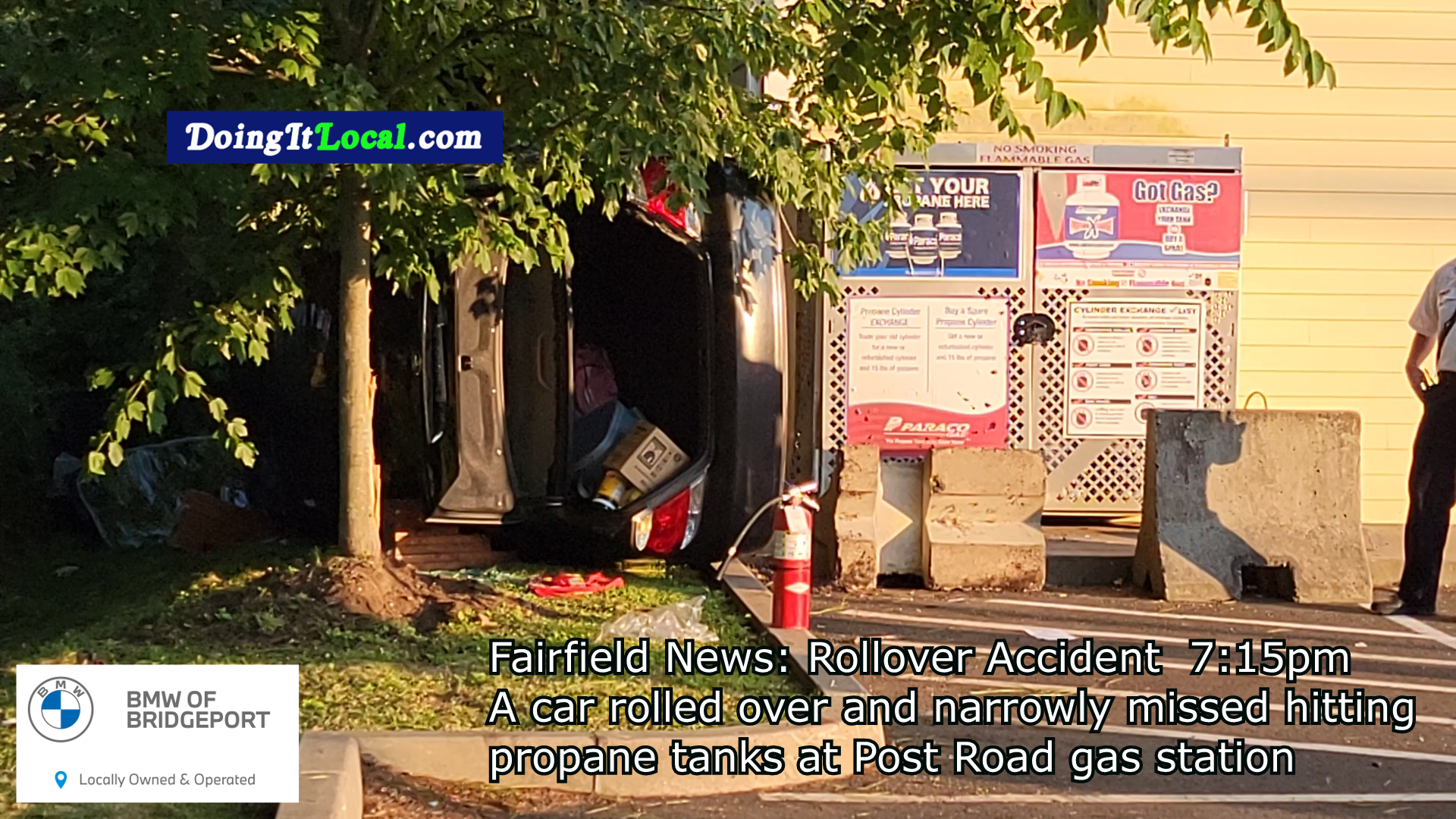 2022-06-29@7:15pm--#Fairfield CT-- Firefighters were called to the Citgo Station at Post and South Pine Creek Road to extricate a person trapped in a rollover accident. The car rolled and just missed hitting propane tanks on the side of the building. The driver was transported to the hospital with unknown injuries. https://youtu.be/HCBVpafgU9Q
