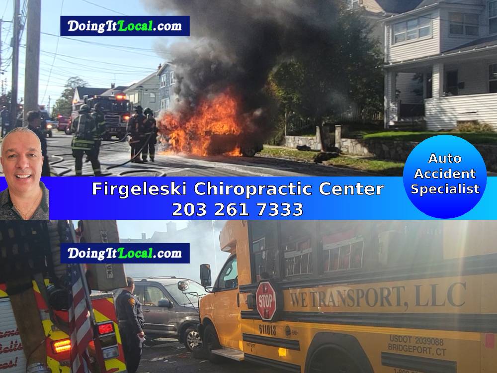 2022-10-18 @3:00PMish–#Bridgeport CT– #ctfire–Firefighters fought a stubborn electrical car fire at Gurdon and Summit Street. A witness told me the electrical car was rear-ended, possibly due to sun glare which was apparent in the video. The car then veered onto Gurdon Street where it hit a school bus waiting at the stop sign.Bridgeport FD posted on their Facebook page: Bridgeport, CT Fire Department responds to three car MVA with one vehicle on fire