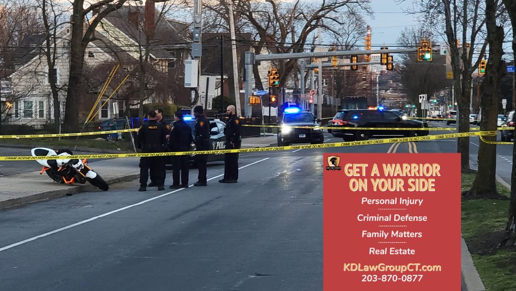 2023-03-28@6:29pm–#Bridgeport CT–A crash between a car and a motorcycle on Main Street near Savoy Street. According to reports the motorcyclist may have a couple of broken bones in his leg/foot. He was alert and conscious when he was transported to the hospital.