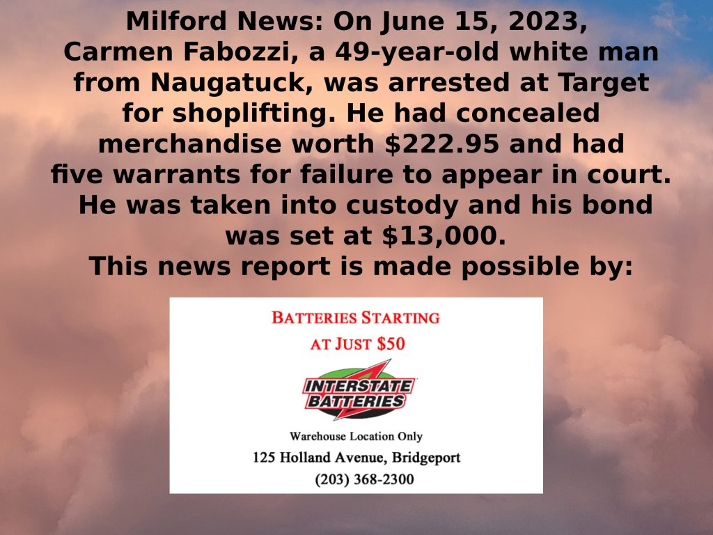 Milford News: On June 15, 2023, Carmen Fabozzi, a 49-year-old white man from Naugatuck, was arrested at Target for shoplifting. He had concealed merchandise worth $222.95 and had five warrants for failure to appear in court. He was taken into custody and his bond was set at $13,000.