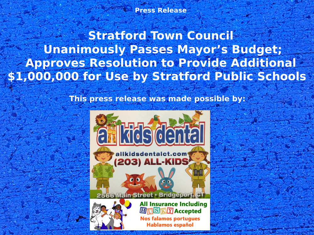 Prior to yesterday, the Town Council held off from voting on the Mayor’s proposed budget while awaiting final passage of the State budget, with hope this would include increased funding for Stratford Public Schools. With the news on Wednesday that the State would not be providing additional funds to Stratford’s schools this coming fiscal year, the Mayor worked with the Town Council to make available an additional $1 million for Stratford Public Schools.