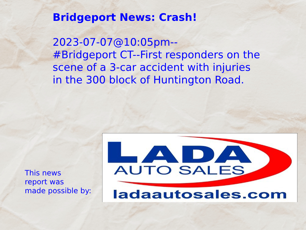 2023-07-07@10:05pm–#Bridgeport CT–First responders on the scene of a 3-car accident with injuries in the 300 block of Huntington Road. The updated radio report says the roadway is closed.