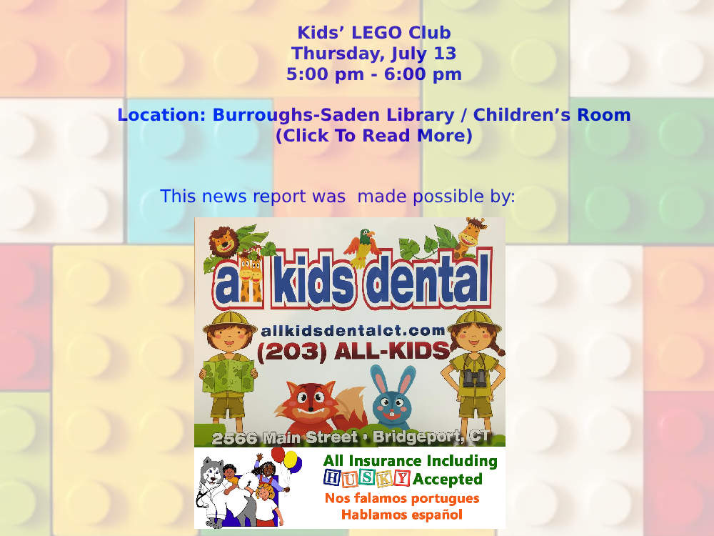 LEGO Club meets once a week on Thursdays from 5-6pm in the Children’s Room of the Main Library, 925 Broad Street. Children in Grades 5 and under must be accompanied in the building by a responsible adult (over the age of 18) who must remain in the Children’s Room for the duration of this program. Any questions? Call us at 203-576-7400 ext. 408.