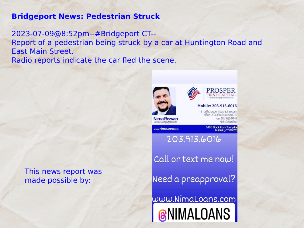 2023-07-09@8:52pm–#Bridgeport CT– Report of a pedestrian being struck by a car at Huntington Road and East Main Street.