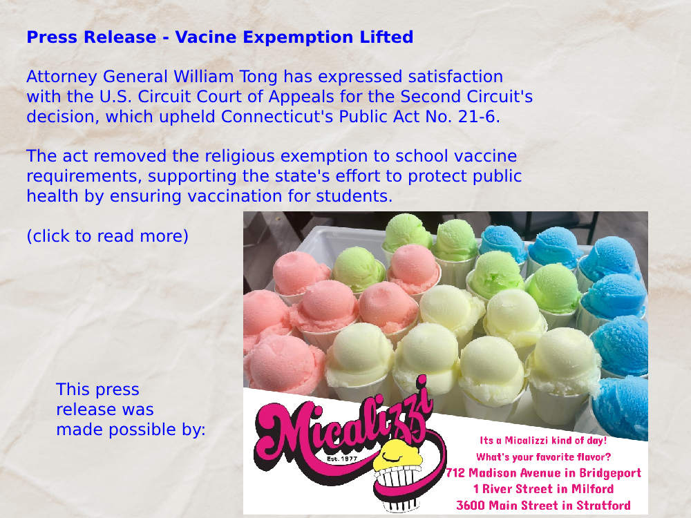 “This decision is a full and resounding affirmation of the constitutionality and legality of Connecticut’s vaccine requirements. Vaccines save lives—this is a fact beyond dispute. The legislature acted responsibly and well within its authority to protect the health of Connecticut families and stop the spread of preventable disease. We will continue to vigorously defend our state’s strong and necessary public health laws,” said Attorney General Tong.