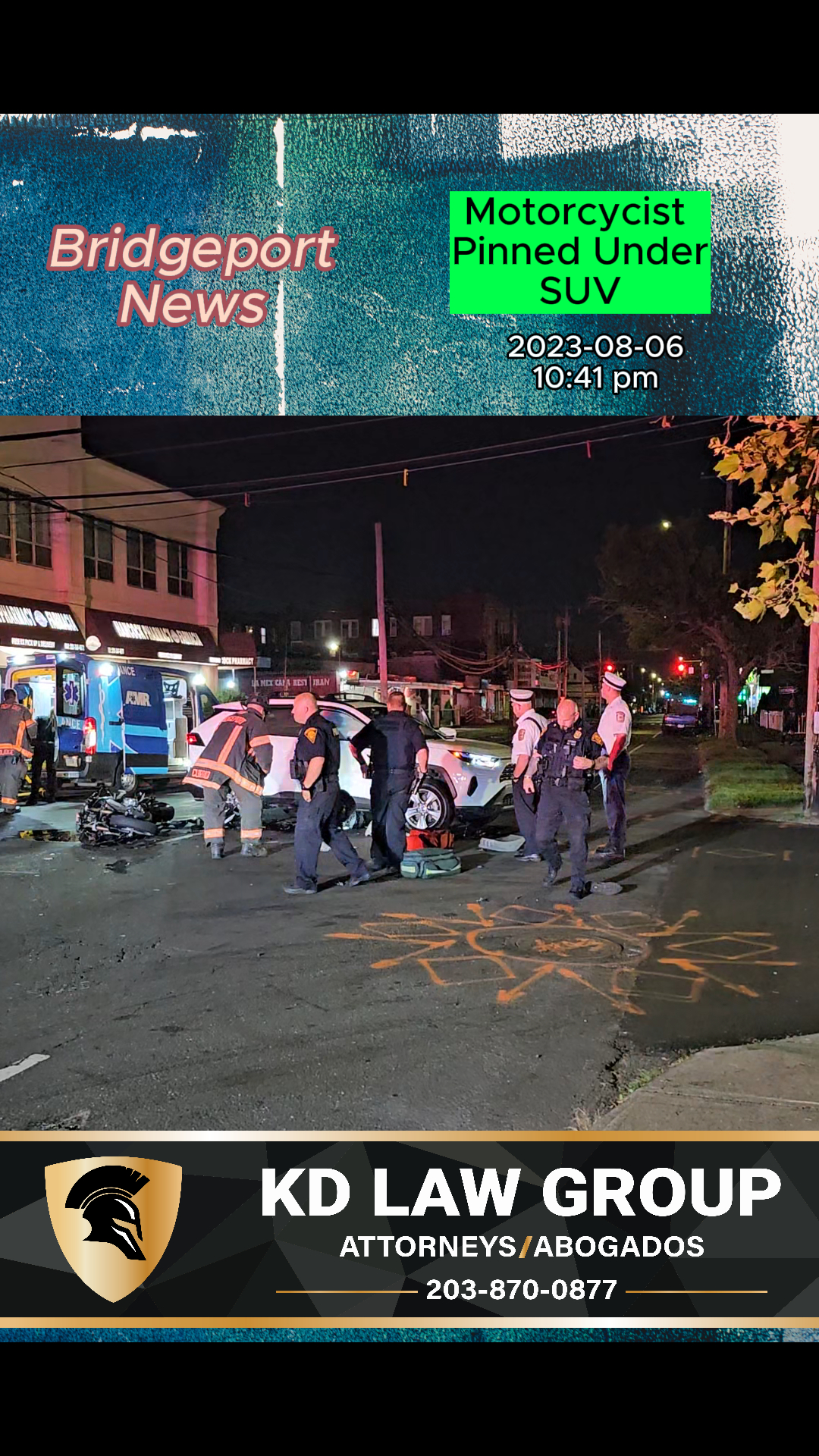 2023-08-06@10:41pm–#Bridgeport CT– A motorcyclist is injured with unknown injuries after colliding with and pinned under an SUV on Fairfield Avenue at Colorado Avenue. Expect Fairfield Avenue to be closed for the accident investigation.