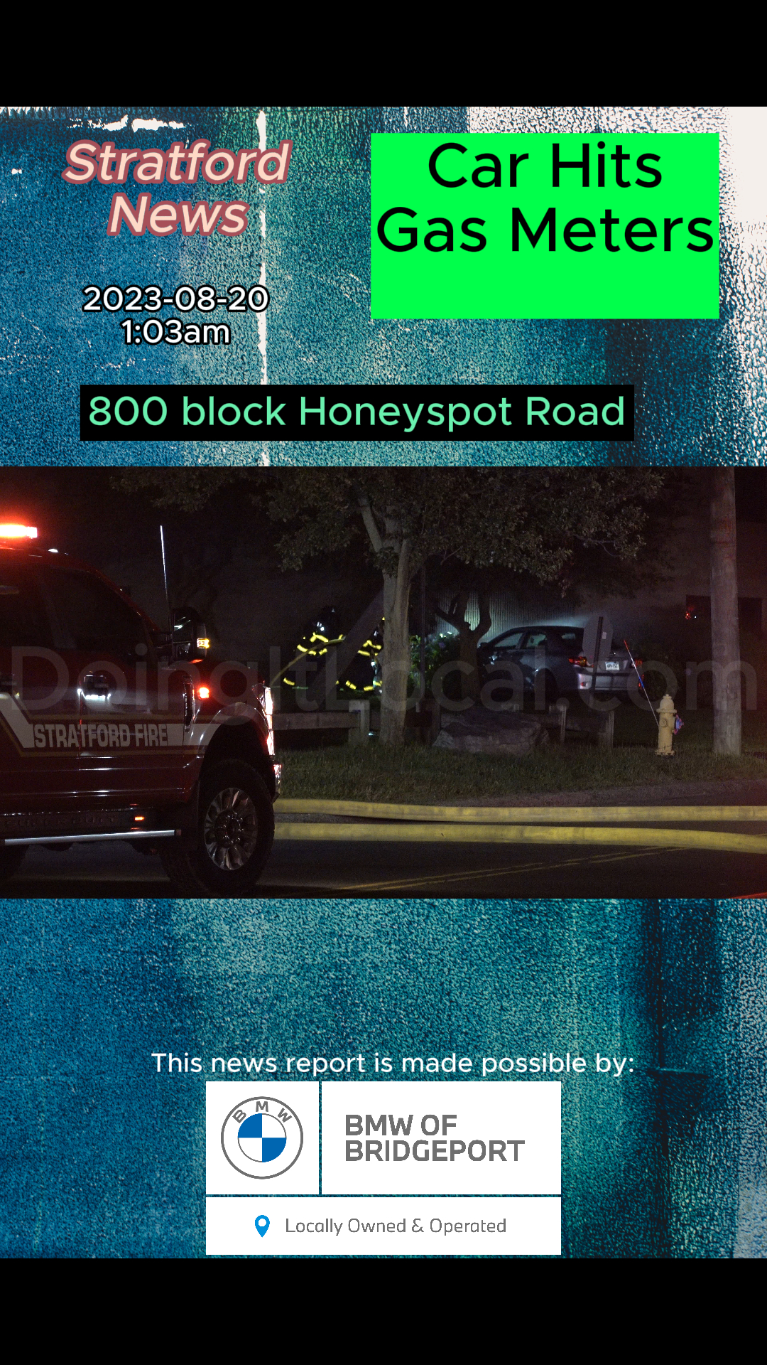 2023-08-20@1:01am–#Stratford CT– A car hit a building in the 800 block of Honeyspot Road striking the gas meters and creating a big gas leak in the neighborhood. The two occupants safely made it out of the car. Radio reports said they may evacuate the neighborhood.