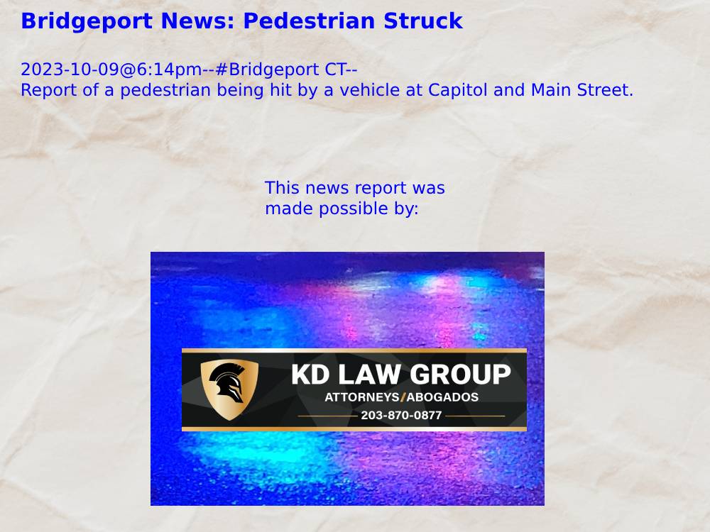 2023-10-09@6:14pm–#Bridgeport CT– Report of a pedestrian being hit by a vehicle at Capitol and Main Street.
