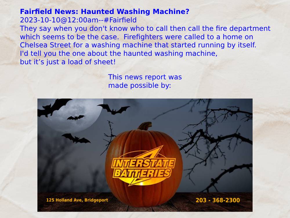 2023-10-10@12:00am–#Fairfield–They say when you don’t know who to call then call the fire department which seems to be the case. Firefighters were called to a home on Chelsea Street for a washing machine that started running by itself.