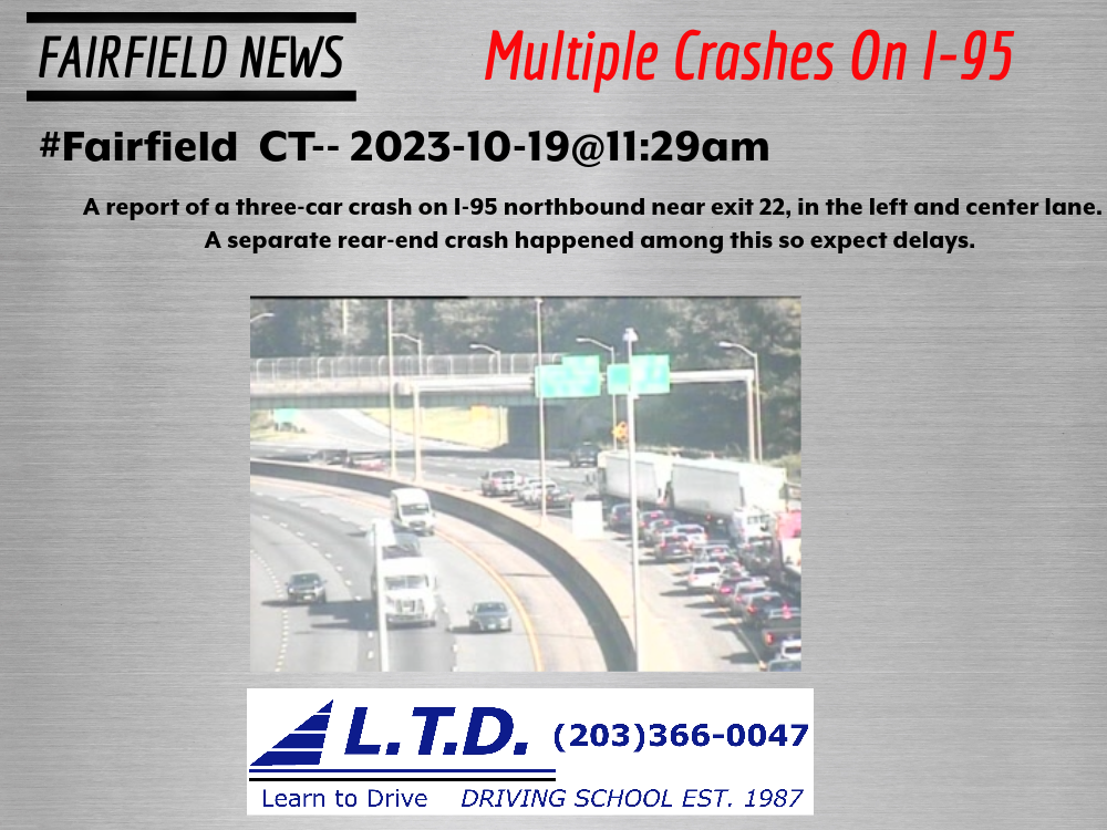2023-10-19@11:29am–#Fairfield CT– #cttraffic– A report of a three-car crash on I-95 northbound near exit 22, in the left and center lane. A separate rear-end crash happened among this so expect delays.