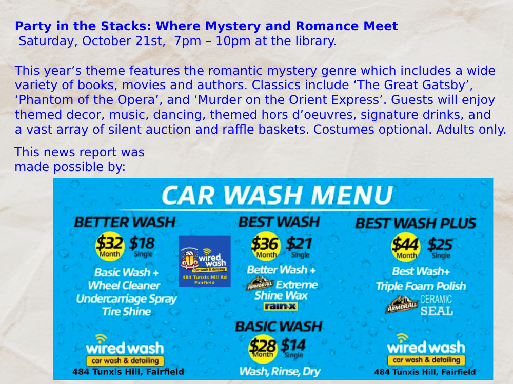 This year’s theme features the romantic mystery genre which includes a wide variety of books, movies and authors. Classics include ‘The Great Gatsby’, ‘Phantom of the Opera’, and ‘Murder on the Orient Express’. Guests will enjoy themed decor, music, dancing, themed hors d’oeuvres, signature drinks, and a vast array of silent auction and raffle baskets. Costumes optional. Adults only.