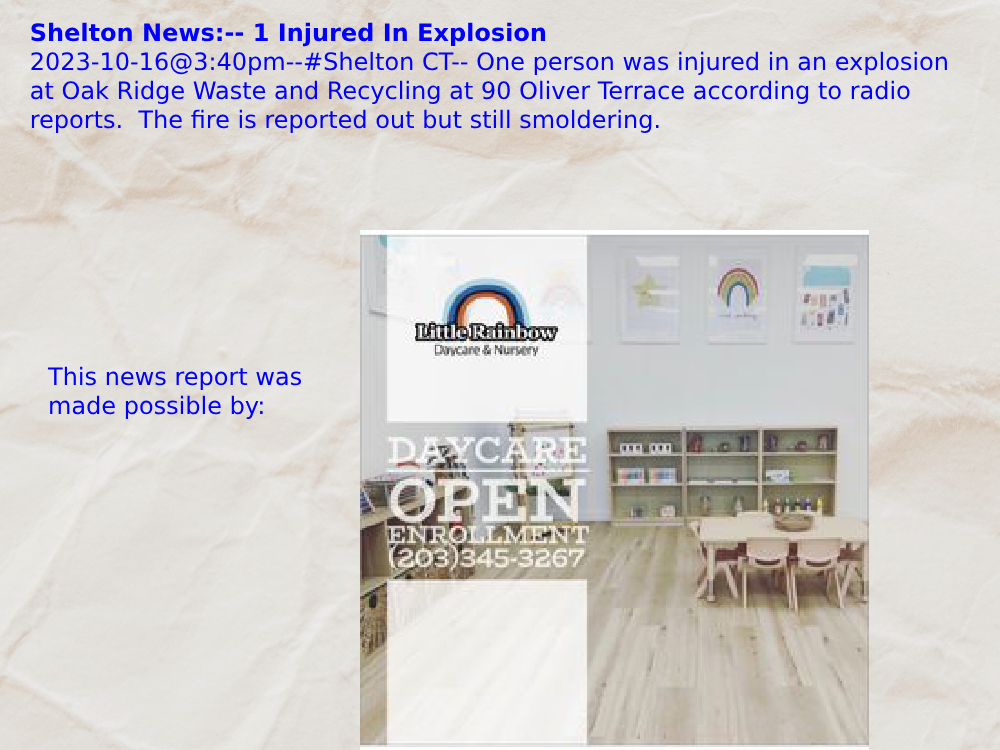 2023-10-16@3:40pm–#Shelton CT– One person was injured in an explosion at Oak Ridge Waste and Recycling at 90 Oliver Terrace according to radio reports. The fire is reported out but still smoldering.