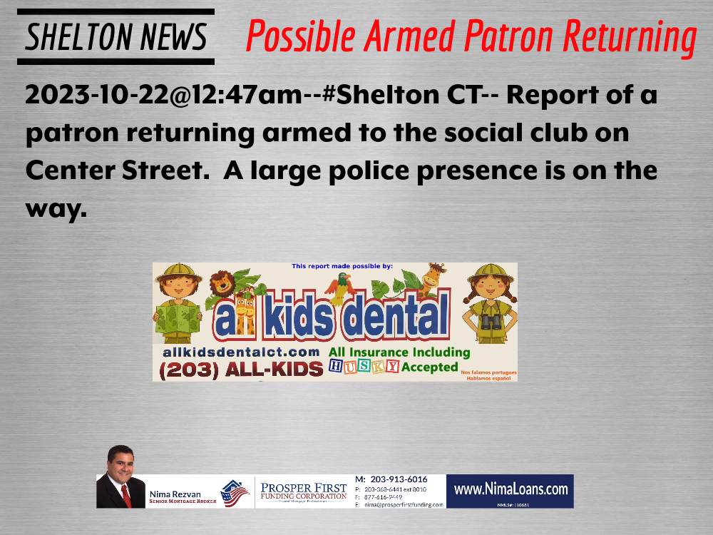 2023-10-22@12:47am–#Shelton CT– Report of a patron returning armed to the social club on Center Street. A large police presence is on the way.