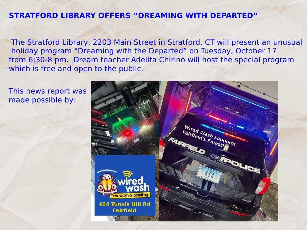 The Stratford Library, 2203 Main Street in Stratford, CT will present an unusual holiday program “Dreaming with the Departed” on Tuesday, October 17 from 6:30-8 pm. Dream teacher Adelita Chirino will host the special program which is free and open to the public.