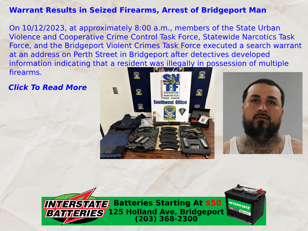 #Bridgeport CT– On 10/12/2023, at approximately 8:00 a.m., members of the State Urban Violence and Cooperative Crime Control Task Force, Statewide Narcotics Task Force, and the Bridgeport Violent Crimes Task Force executed a search warrant at an address on Perth Street in Bridgeport after detectives developed information indicating that a resident was illegally in possession of multiple firearms.