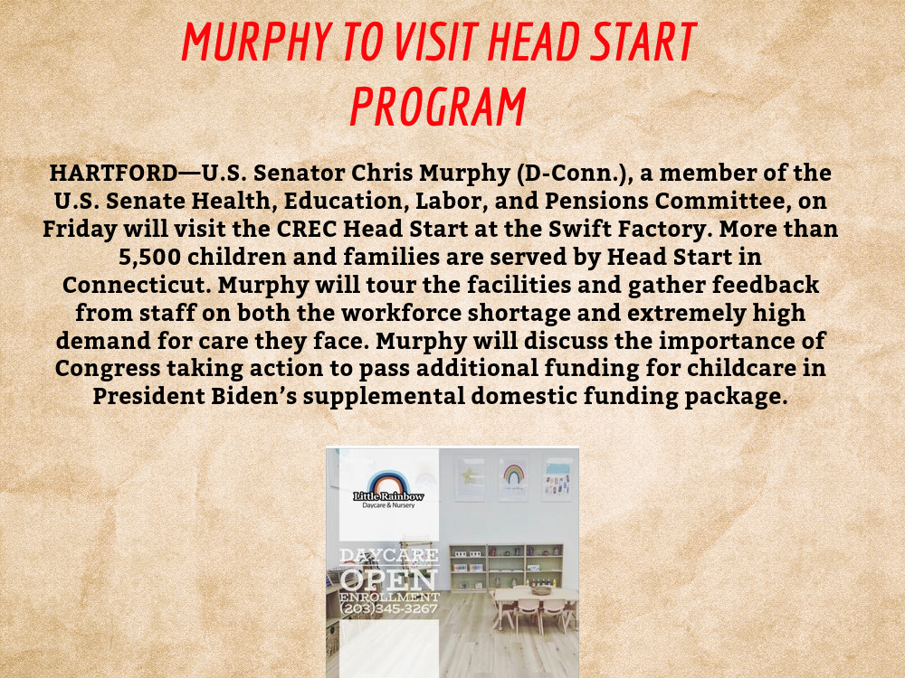 HARTFORD—U.S. Senator Chris Murphy (D-Conn.), a member of the U.S. Senate Health, Education, Labor, and Pensions Committee, on Friday will visit the CREC Head Start at the Swift Factory. More than 5,500 children and families are served by Head Start in Connecticut. Murphy will tour the facilities and gather feedback from staff on both the workforce shortage and extremely high demand for care they face. Murphy will discuss the importance of Congress taking action to pass additional funding for childcare in President Biden’s supplemental domestic funding package.