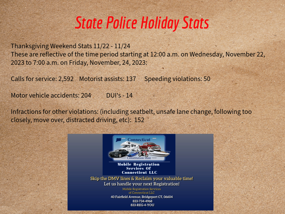 Thanksgiving Weekend Stats 11/22 - 11/24 These are reflective of the time period starting at 12:00 a.m. on Wednesday, November 22, 2023 to 7:00 a.m. on Friday, November, 24, 2023: Calls for service: 2,592 Motorist assists: 137 Speeding violations: 50 Motor vehicle accidents: 204 DUI's - 14 Infractions for other violations: (including seatbelt, unsafe lane change, following too closely, move over, distracted driving, etc): 152