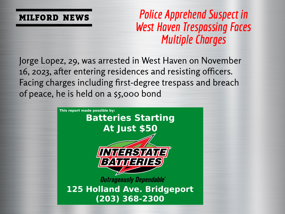 On the evening of November 16, 2023, Officer Hopkins responded to multiple calls from residents on Lawrence Avenue, Field Court, and Welch’s Point Road. Jorge Lopez, a 29-year-old male residing on W. Main Street, West Haven, was reported for trespassing into a residence and attempting entry into two others, where he was unfamiliar to the occupants. The police located Lopez inside a truck parked diagonally in the driveway of a residence on Welch’s Point Road. Despite being uncooperative and actively resisting arrest during the investigation, officers managed to gain control, leading to Lopez’s apprehension and subsequent custody. The charges against him include first-degree trespass, three counts of second-degree breach of peace, interfering with an officer, and failure to drive right. A bond of $5,000 has been set.