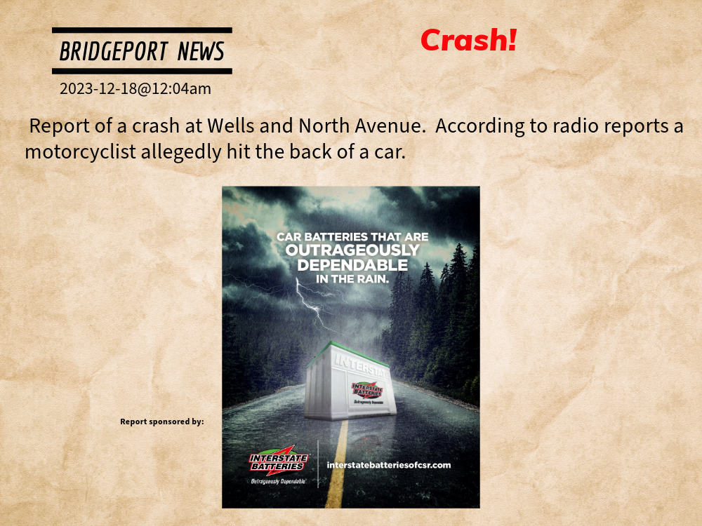 2023-12-18@12:04am–#BridgeportI CT– Report of a crash at Wells and North Avenue. According to radio reports a motorcyclist allegedly hit the back of a car.