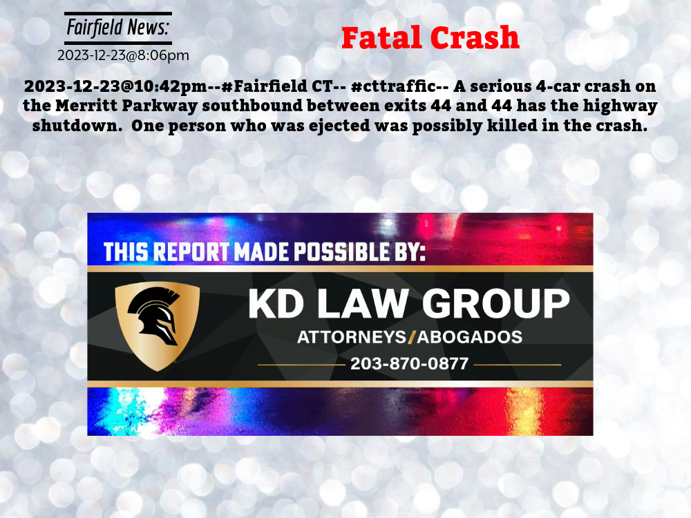 2023-12-23@10:42pm–#Fairfield CT– #cttraffic– A serious 4-car crash on the Merritt Parkway southbound between exits 44 and 44 has the highway shutdown. One person who was ejected was possibly killed in the crash.