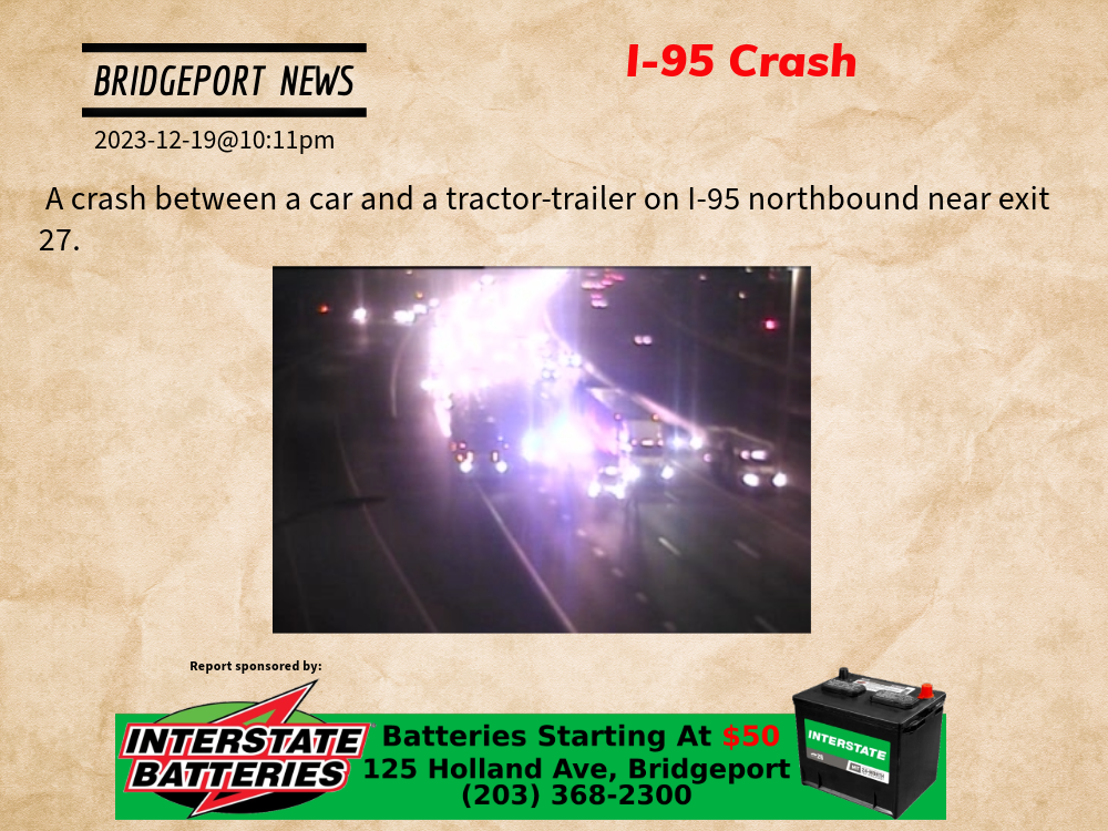 2023-12-19@10:11pm–#Bridgeport CT– #cttraffic— A crash between a car and a tractor-trailer on I-95 northbound near exit 27.