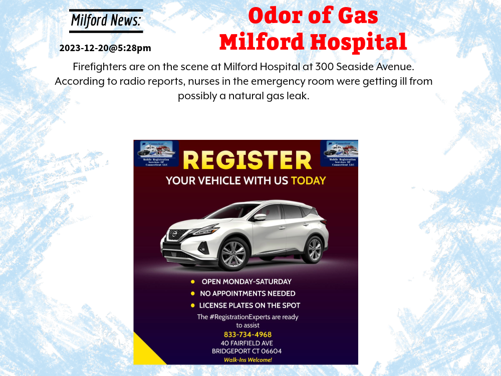 2023-12-20@5:28pm–#Milford CT– Firefighters are on the scene at Milford Hospital at 300 Seaside Avenue. According to radio reports, nurses in the emergency room were getting ill from possibly a natural gas leak.