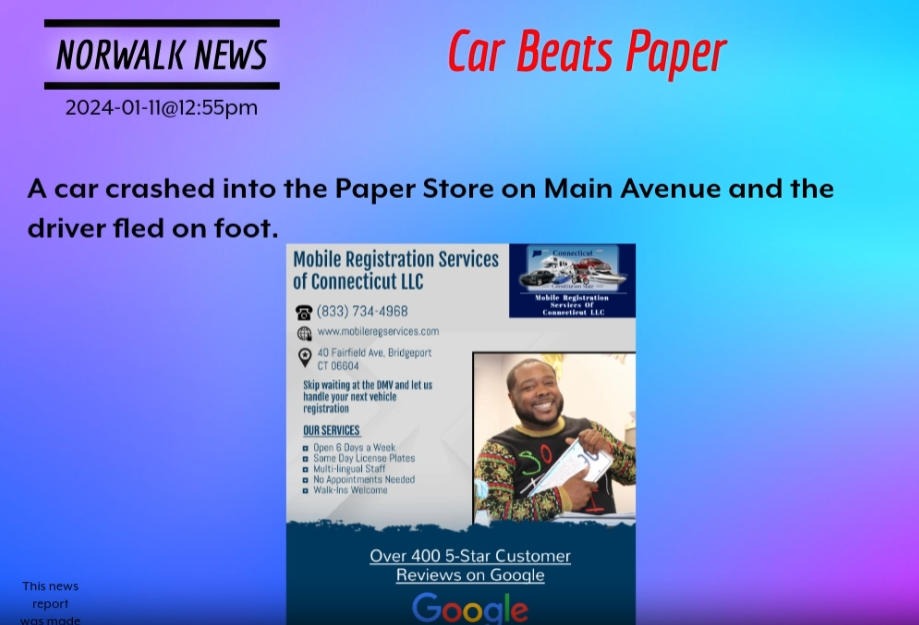 2024-01-11@12:55pm–#Norwalk CT– A car crashed into the Paper Store on Main Avenue and the driver fled on foot.