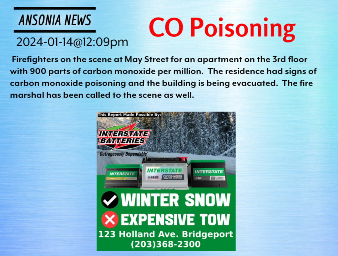 2024-01-14@12:09pm–#Ansonia CT– Firefighters on the scene at May Street for an apartment on the 3rd floor with 900 parts of carbon monoxide per million. The residence had signs of carbon monoxide poisoning and the building is being evacuated. The fire marshal has been called to the scene as well.