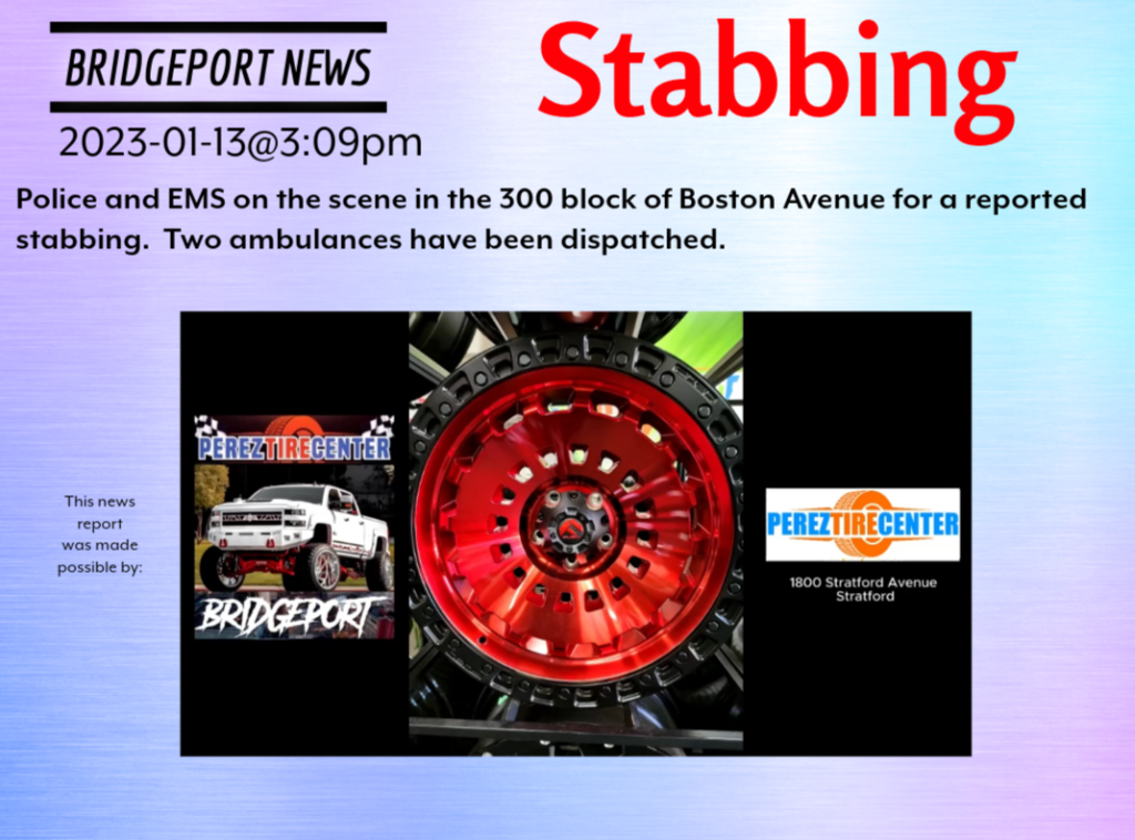 2023-01-13@3:09pm–#Bridgeport CT– Police and EMS on the scene in the 300 block of Boston Avenue for a reported stabbing. Two ambulances have been dispatched.