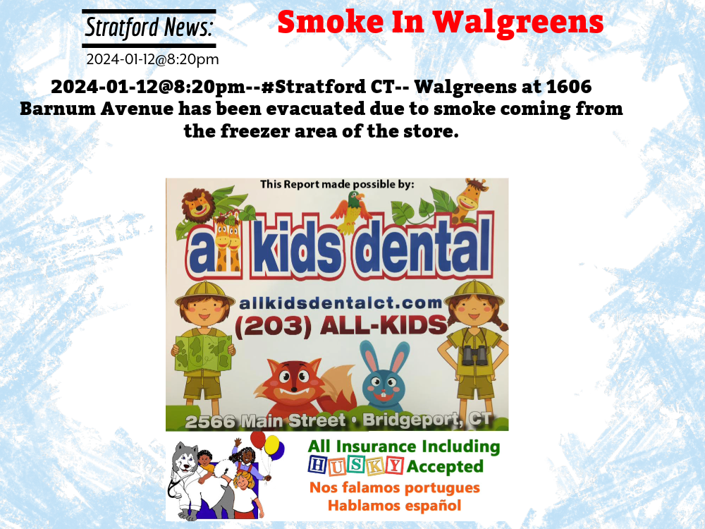 2024-01-12@8:20pm–#Stratford CT– Walgreens at 1606 Barnum Avenue has been evacuated due to smoke coming from the freezer area of the store. Firefighters are on scene and investigating.