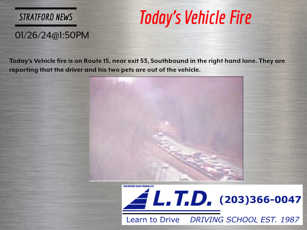 1/26/24@1:50PM–#cttraffic Today’s Vehicle fire is on Route 15, near exit 53, Southbound in the right hand lane. They are reporting that the driver and his two pets are out of the vehicle.