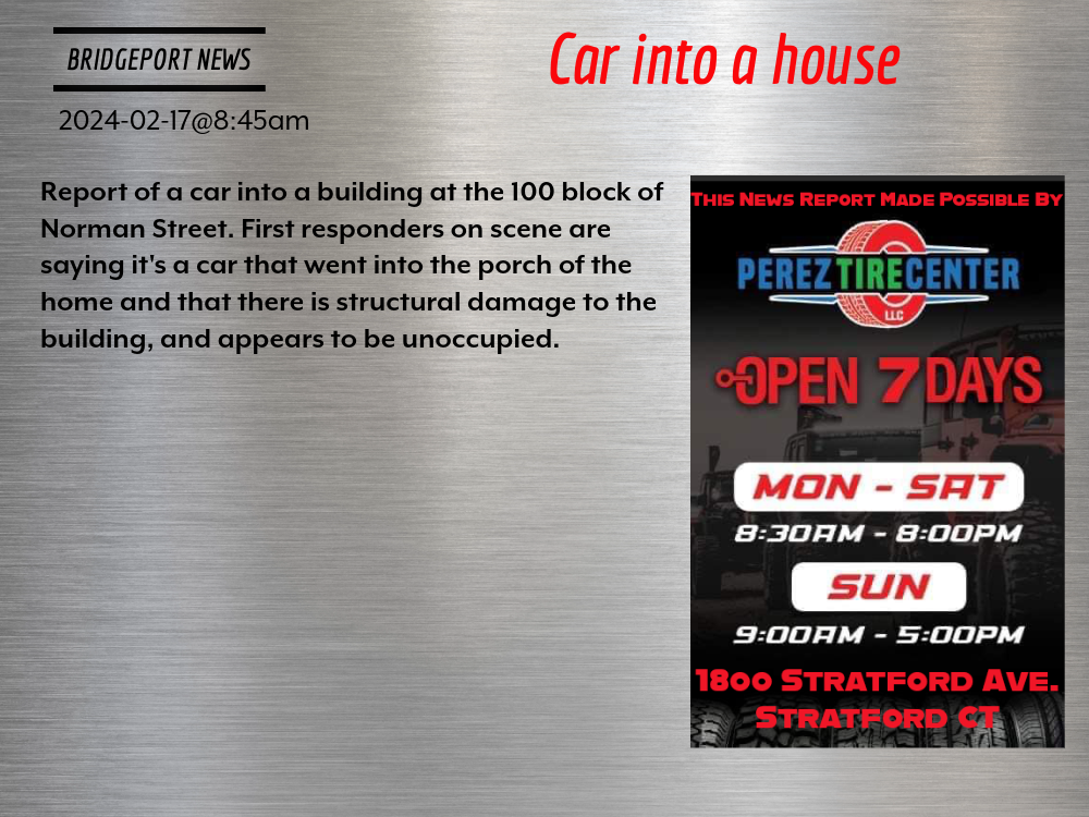 Report of a car into a building at the 100 block of Norman Street. First responders on scene are saying it’s a car that went into the porch of the home and that there is structural damage to the building, and appears to be unoccupied.