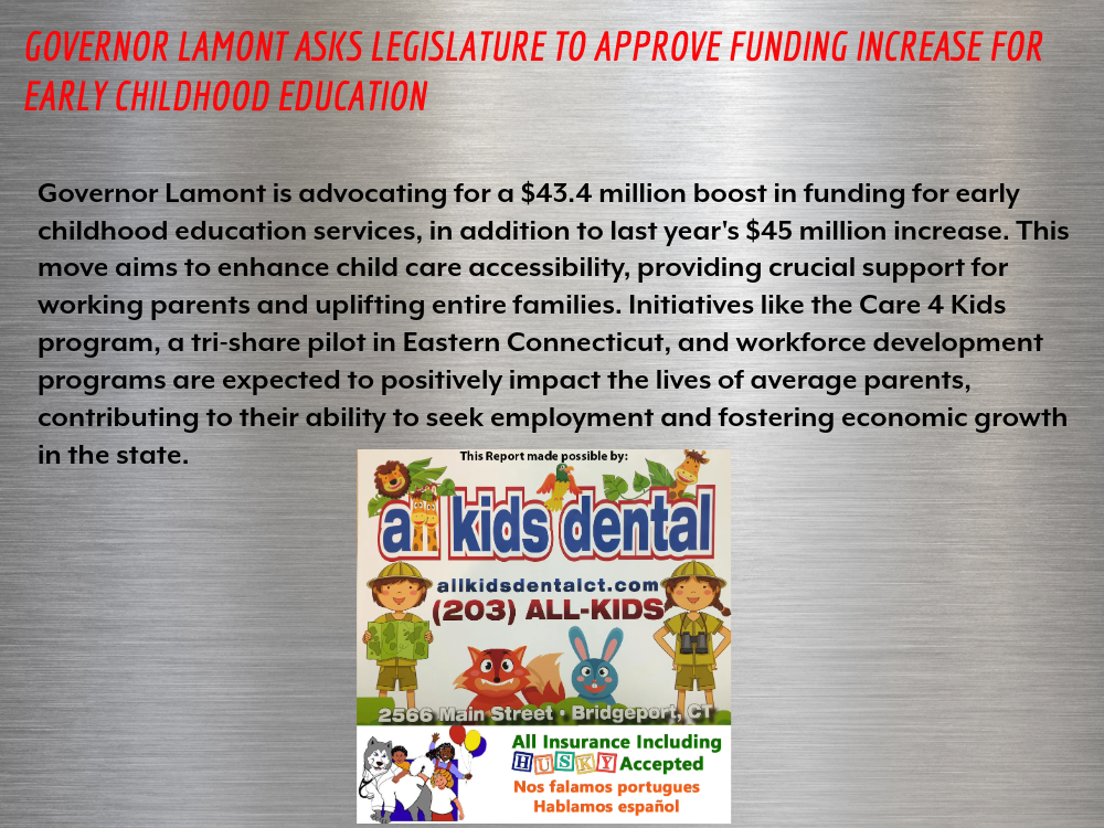 The proposed $43.4 million will be used for a broad range of investments, most notably an increase in Care 4 Kids, which helps low to moderate-income families pay for the costs of child care. It will also fund a tri-share pilot program in Eastern Connecticut to support more child care options for families with direct engagement of the business community.