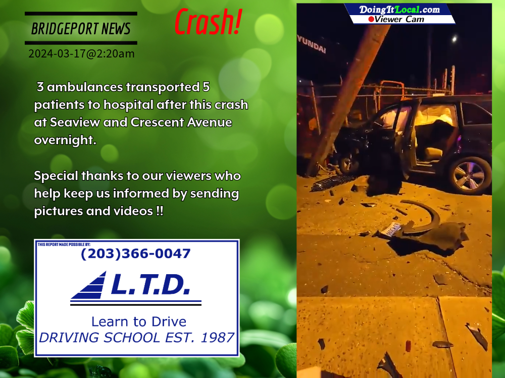 2024-03-17@2:20am–#Bridgeport CT– 3 ambulances transported 5 patients to hospital after this crash at Seaview and Crescent Avenue overnight.