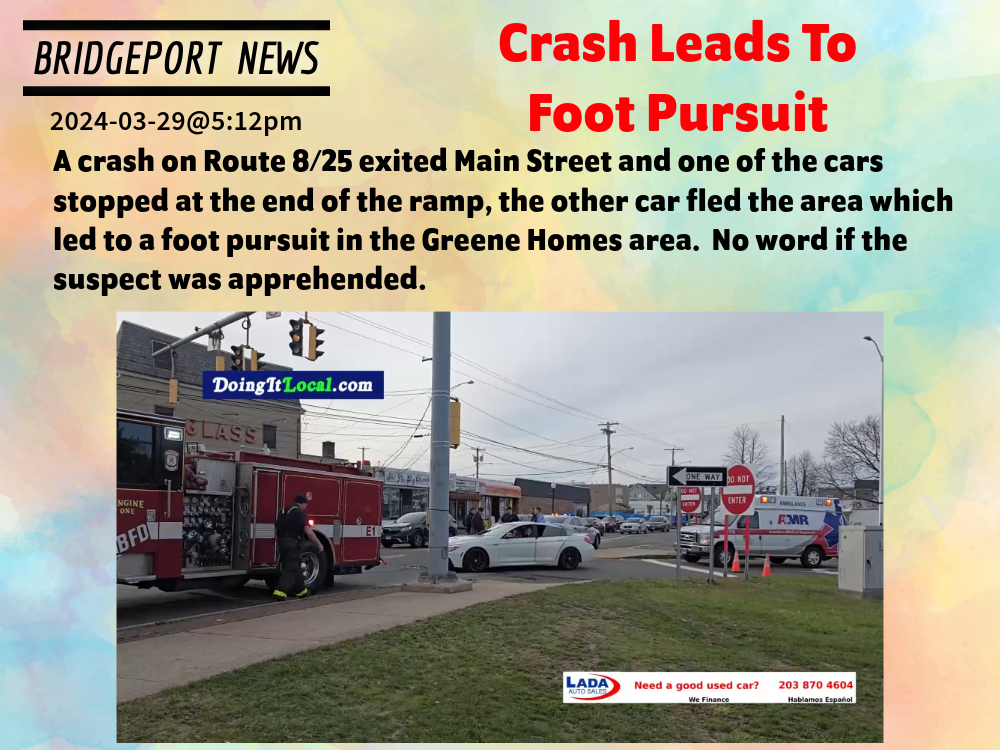 2024-03-29@5:12pm–#Bridgeport CT– A crash on Route 8/25 exited Main Street and one of the cars stopped at the end of the ramp, the other car fled the area which led to a foot pursuit in the Greene Homes area. No word if the suspect was apprehended.