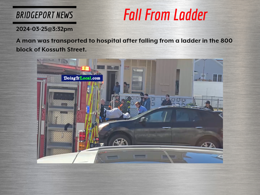 2024-03-25@3:32pm–#Bridgeport CT– A man was transported to hospital after falling from a ladder in the 800 block of Kossuth Street.
