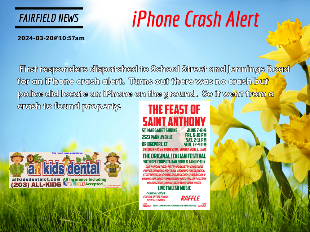 2024-03-20@10:57am– #Fairfield CT– First responders dispatched to School Street and Jennings Road for an iPhone crash alert. Turns out there was no crash but police did locate an iPhone on the ground. So it went from a crash to found property!